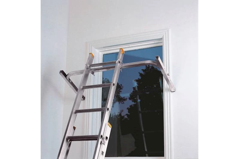 - Aluminum bracket with vertical adjustments from 13″ to 25″. 48″ span works equally well with single and extension ladders.